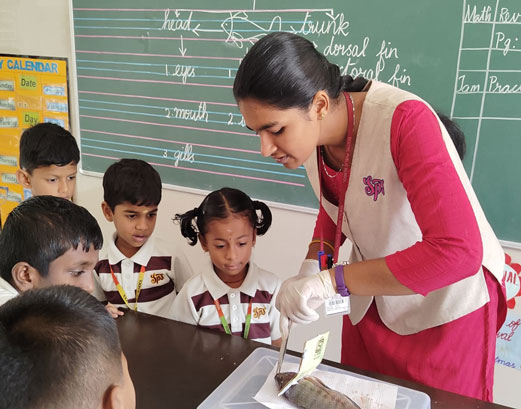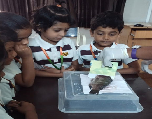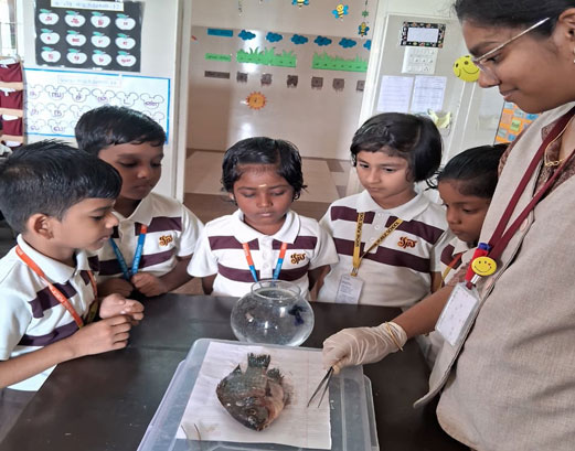 Our little explorers dove into the underwater world to learn the parts of a fish – using specimen. With curious eyes and eager ears our young scientists observed and identified the head, fish, tail, and gills, and scales. They discovered how each part helps fish swim, breathe, and stay safe in water. After the hands-on exploration, students: