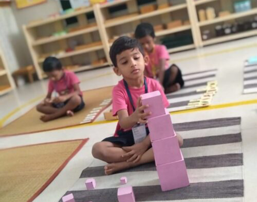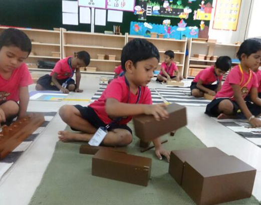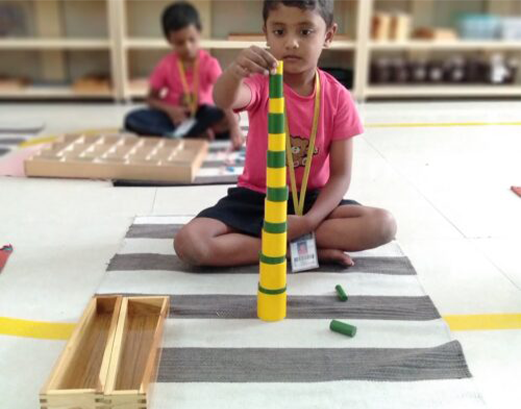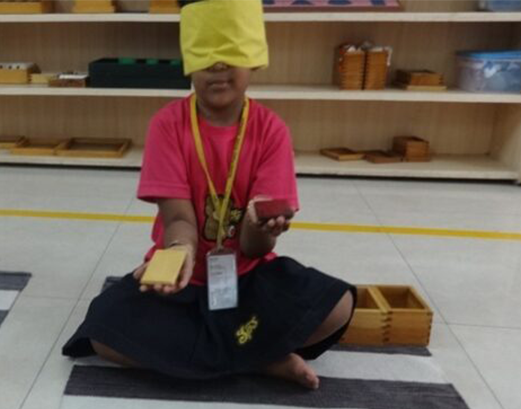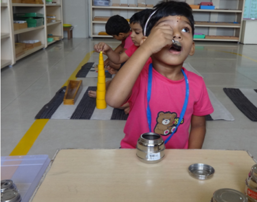 The sensorial materials are designed with built-in feedback to control errors aimed to show when a mistake has been made. Children are encouraged to be independent of oversight which develops their self-confidence and incentive to practice and improve. A child’s sense perceptions will become structured and capable of comprehending abstract concepts through experiencing sensorial lessons. The sensorial area is divided into six categories: size, form, color, tactile, gustatory, olfactory, and auditory.